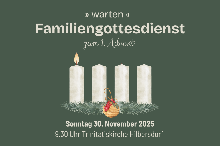 Es ist Advent und wir laden alle zum Familiengottesdienst am 30. November um 09.30 Uhr in der Trinitatiskirche ein. Das Thema wird „warten“ sein. Wie jedes Jahr ist danach noch Zeit zum Verweilen! Gemeinsam wollen wir im Gemeindehaus Strohsterne basteln, miteinander ins Gespräch kommen und adventliche Köstlichkeiten teilen. Bringen Sie gern Kuchen, Salate oder andere Kleinigkeiten fürs Buffet mit.
