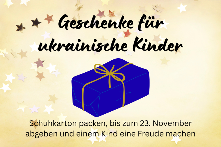 Die ukrainische Gemeinde, die in unserer Trinitatiskirche ihre Gottesdienste feiert, sammelt Nikolausgeschenke. Diese gehen an ukrainische Kinder, die vom Krieg betroffen sind, Waisen oder Halbwaisen sind oder in einem Kinderheim leben. Packen Sie einfach einen Schuhkarton mit Spielzeug, Schreibwaren, Süßigkeiten, Stiften oder ähnlichem. Bitte verpacken Sie es schön und beschriften Sie, ob es für einen Jungen oder ein Mädchen ist. Das Geschenk können sie nächsten Sonntag, den 23. November, von 9 bis 13 Uhr in die Kirche bringen. Alternativ können Sie es in der Kanzlei abgeben (Dienstag 14 – 18 Uhr, Donnerstag 10 – 12 Uhr) oder am Mittwoch zum Gottesdienst am Buß und Bettag um 10 Uhr.