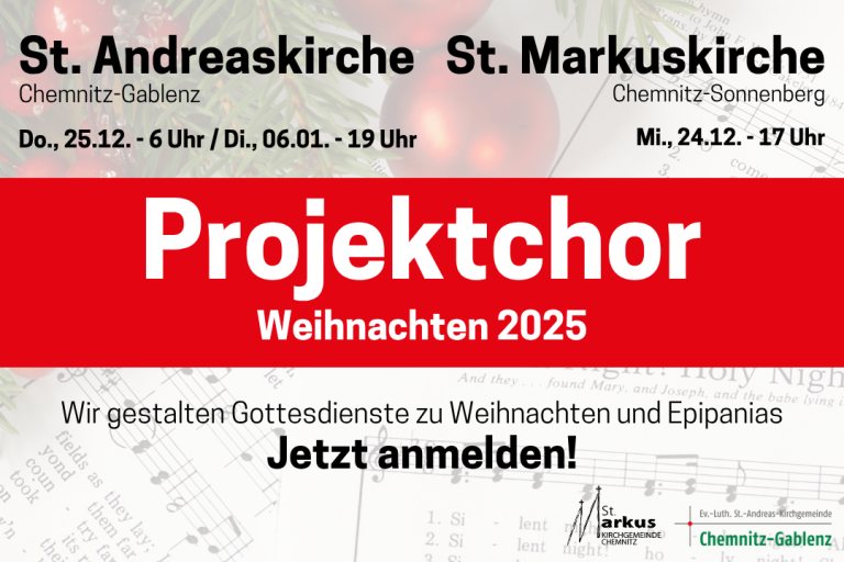 Wir gestalten die musikalische Christvesper am 24.12., um 17 Uhr in der Markuskirche (Musikalische Leitung: S. Beyer) und umrahmen und ergänzen das Krippenspiel der Jungen Gemeinde am 1. Weihnachtsfeiertag, 25.12., um 6 Uhr und am 06.01.2026 um 19 Uhr in der St. Andreaskirche (Musikalische Leitung: Kantor Stadler).