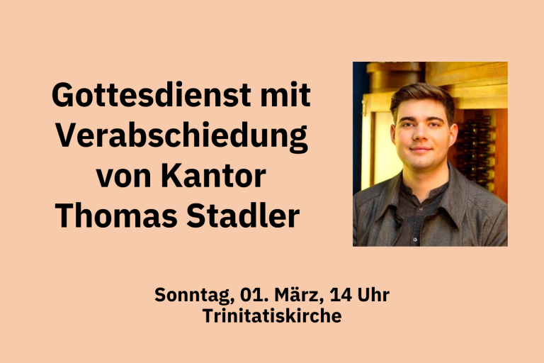 Am Sonntag, dem 01. März, um 14 Uhr findet in der Trinitatiskirche die Verabschiedung des Kantors Thomas Stadler statt. Der Gottesdienst wird von den musikalischen Gruppen der Gemeinden St. Andreas, St. Markus und Trinitatis ausgestaltet.