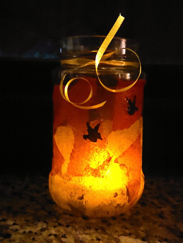 Schneide oder reiße kleine Stücke vom Transparentpapier ab. Stanze mit dem Papierstanzer kleine Tauben aus dem Transparentpapier aus. Bestreiche jedes Stück Papier einzeln mit dem Bastelleim und klebe sie auf das Glas auf. Lass alles trocknen, zünde danach das Teelicht an und lege es vorsichtig in das Glas.